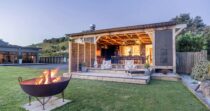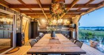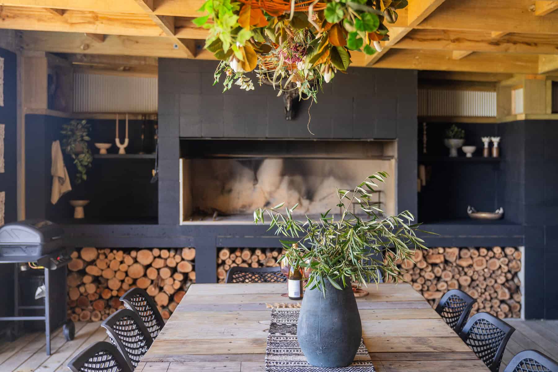 Outside on the large covered patio, there is a full kitchen with a dishwasher, fridge, and a fantastic gas oven. Also on the patio is a large table and chairs and a great outdoor fireplace that will heat the whole area, such a wonderful place to relax and enjoy a glass of bubbles.