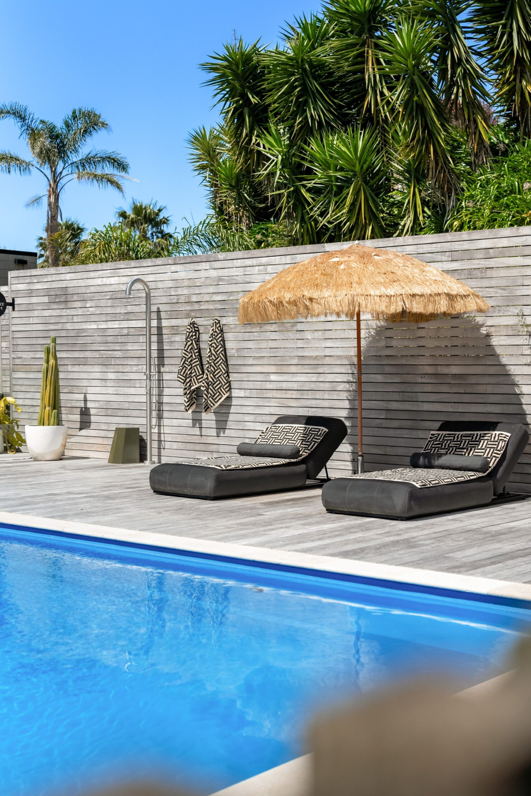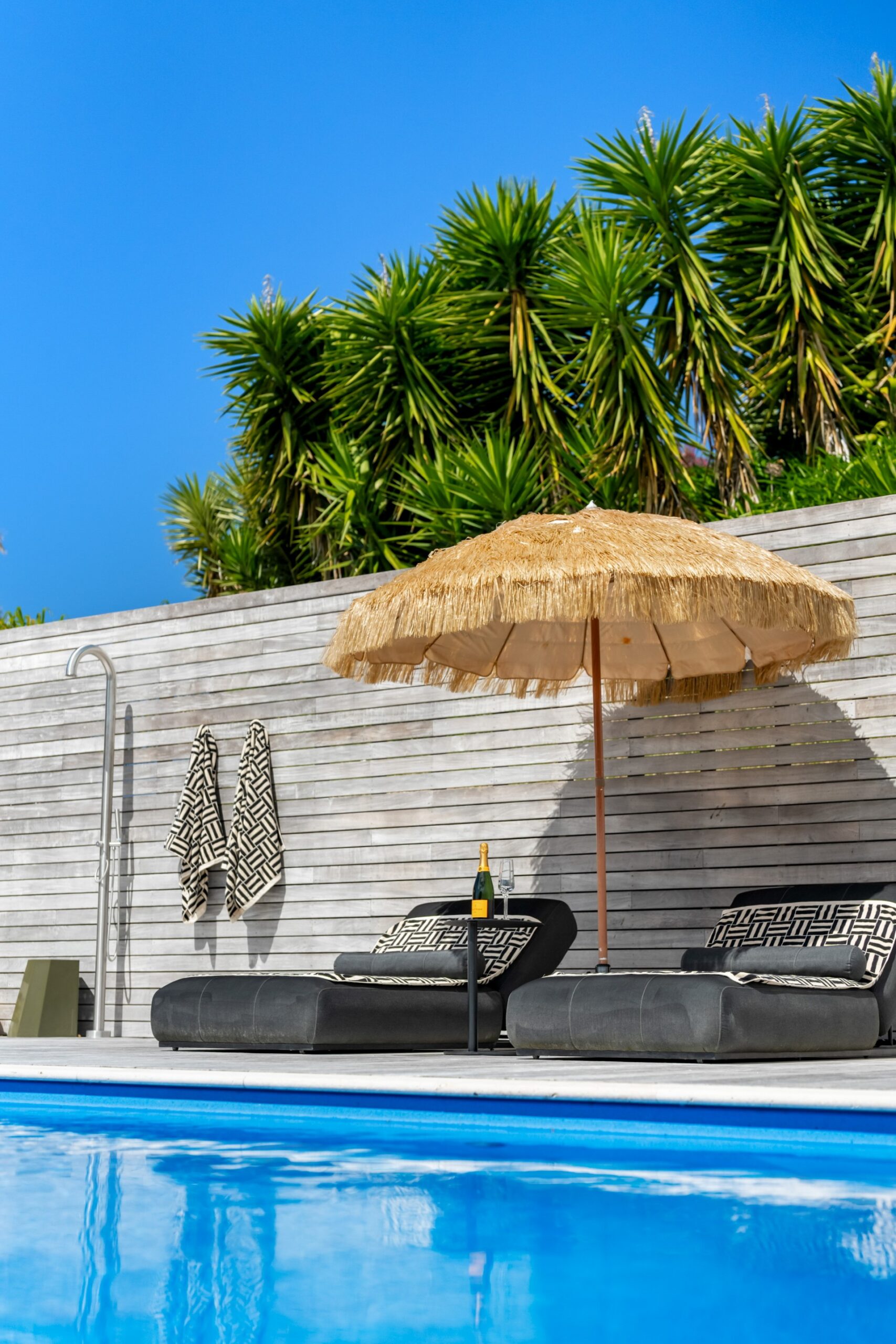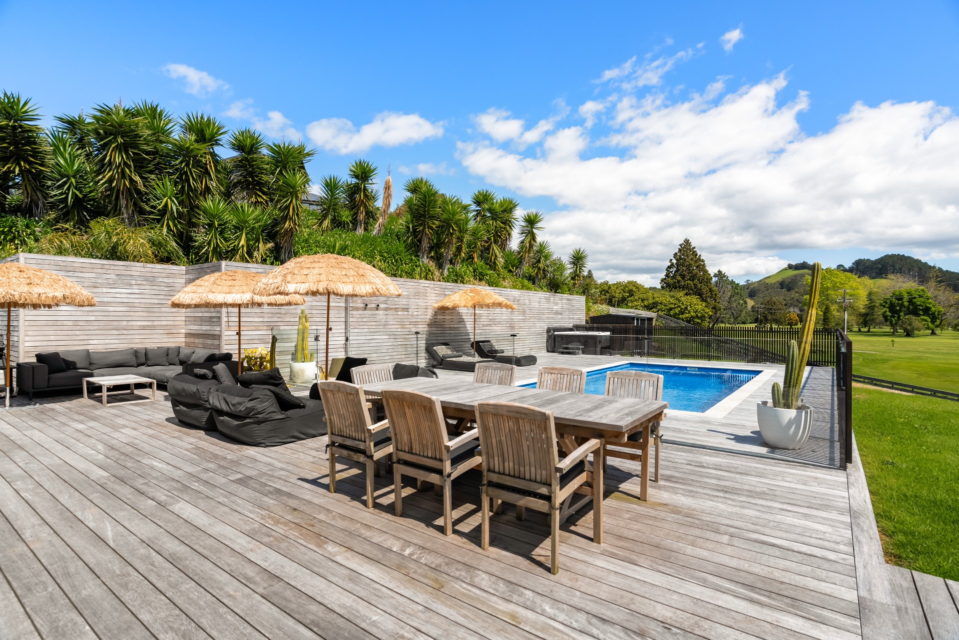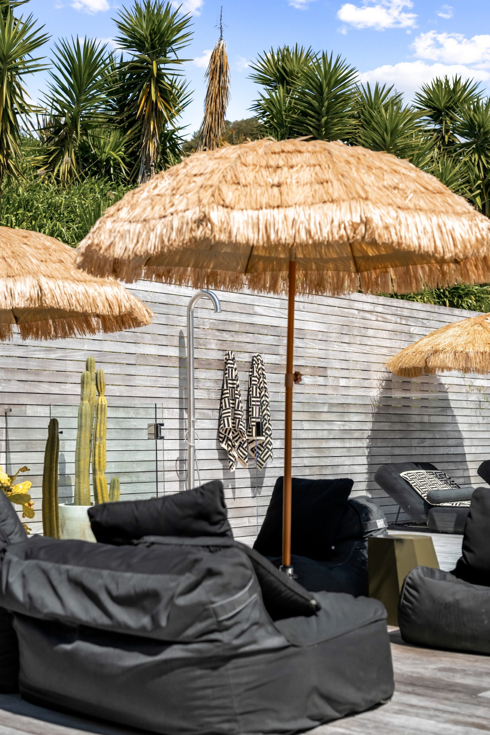 Along the main living area are large ranch sliders that take you out to the most stunning outdoor area. With a swimming pool, hot tub, outdoor shower and grass umbrellas you will feel like you are on a tropical island! With plenty of sun loungers, it is a fantastic spot to enjoy sunbathing, reading a book or just watching the kids in the pool. There is also a large outdoor table & chairs and a BBQ a great spot to enjoy your evening meals.