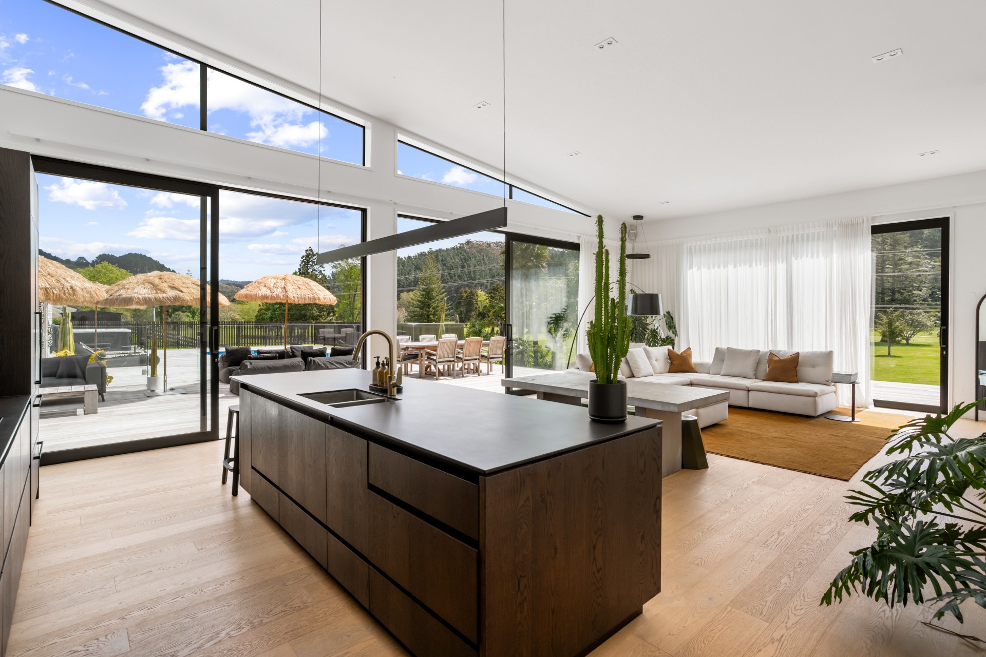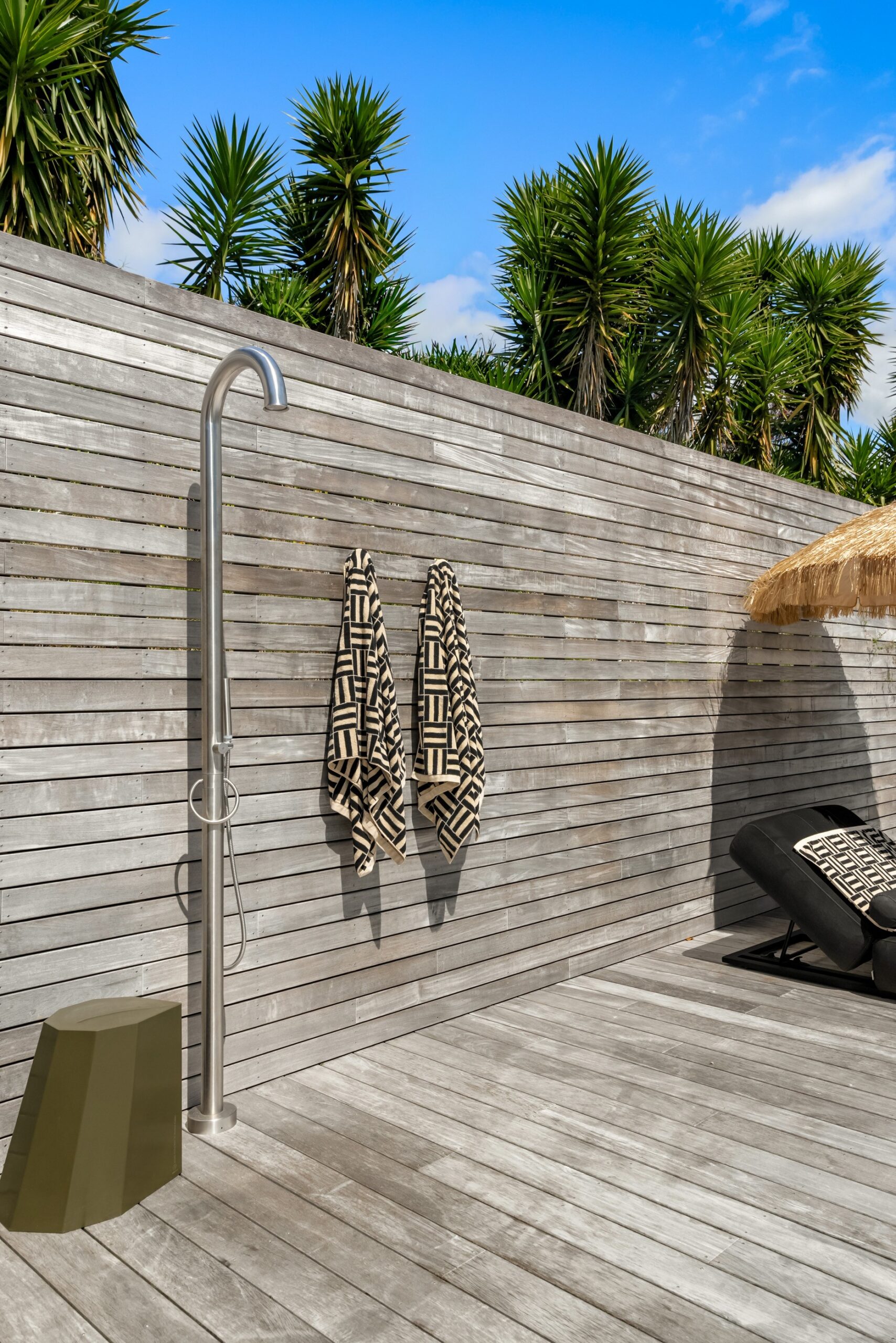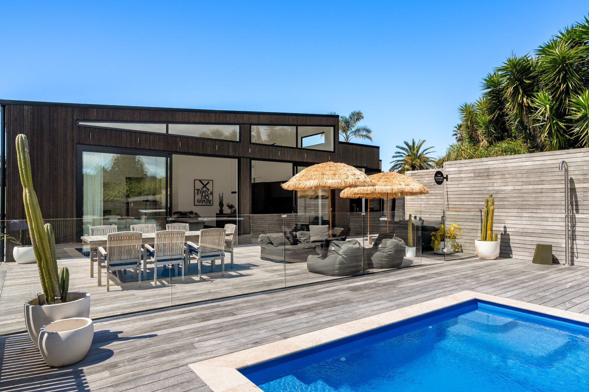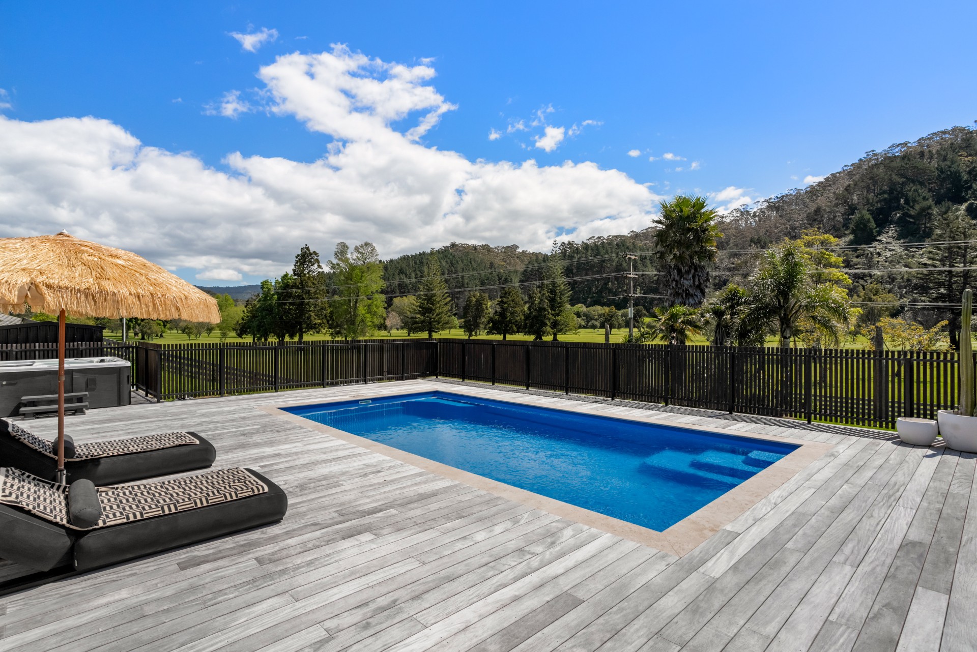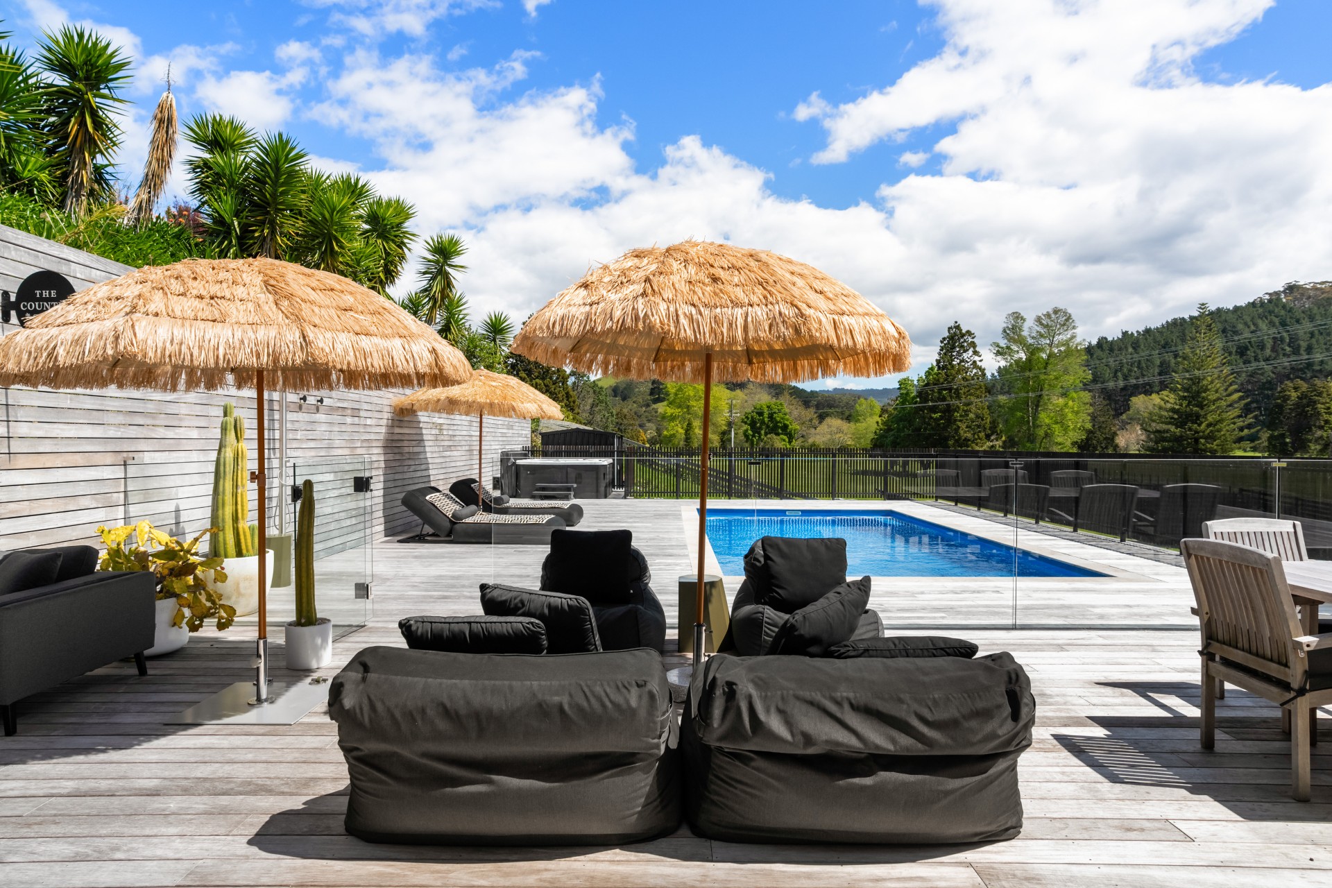 Along the main living area are large ranch sliders that take you out to the most stunning outdoor area. With a swimming pool, hot tub, outdoor shower and grass umbrellas you will feel like you are on a tropical island! With plenty of sun loungers, it is a fantastic spot to enjoy sunbathing, reading a book or just watching the kids in the pool. There is also a large outdoor table & chairs and a BBQ a great spot to enjoy your evening meals.
