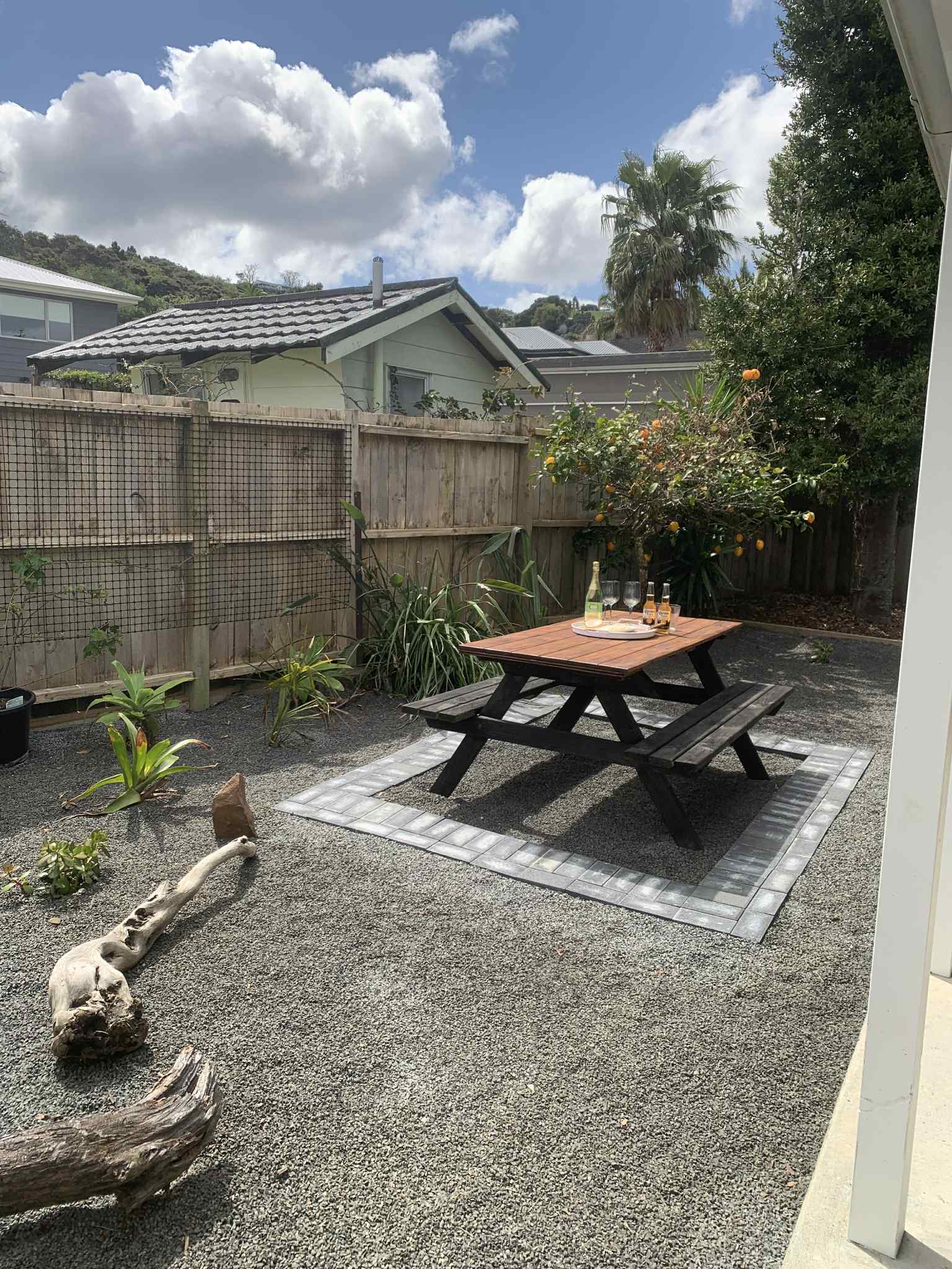 Step outside to a fenced outdoor area with a partially covered patio, BBQ, and picnic table — perfect for evening drinks or dinner under the stars. You can even chat through the kitchen bar window while the chef works their magic.