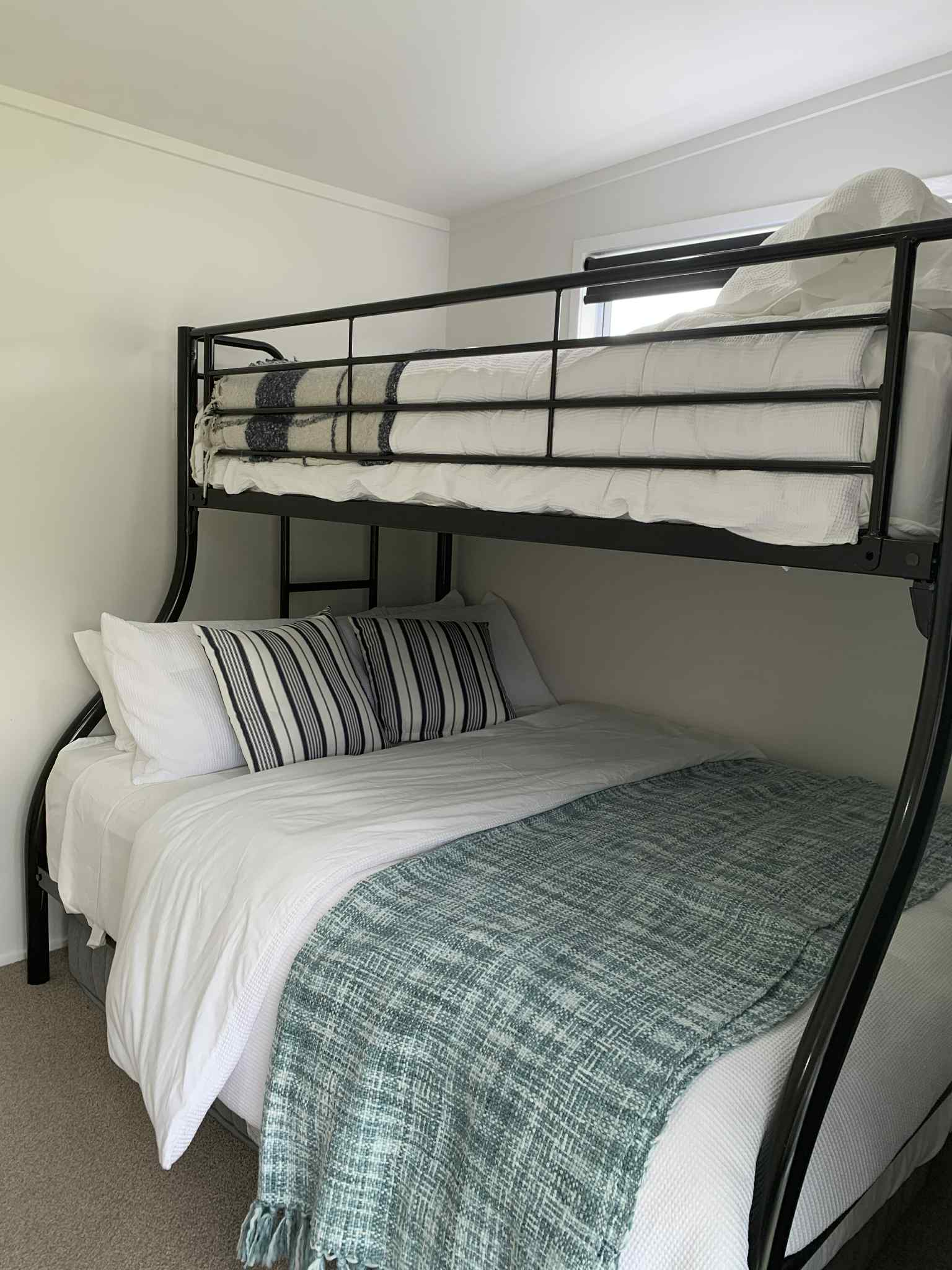 There are two bedroom cabins — one with a queen bed, and the second with a double-down, single-up bunk plus an extra single bed, making it ideal for a family getaway. The bathroom is located in the main cabin.