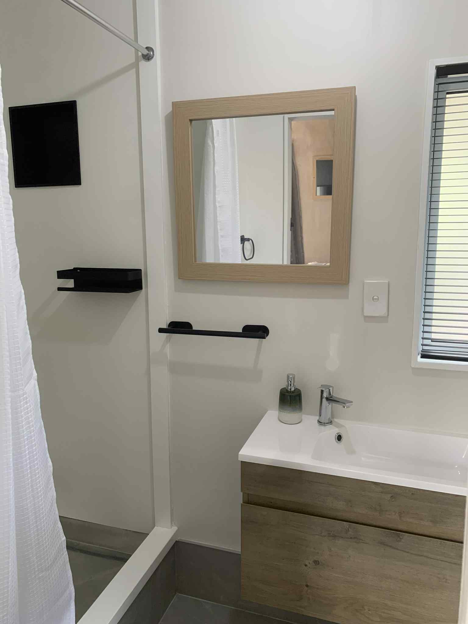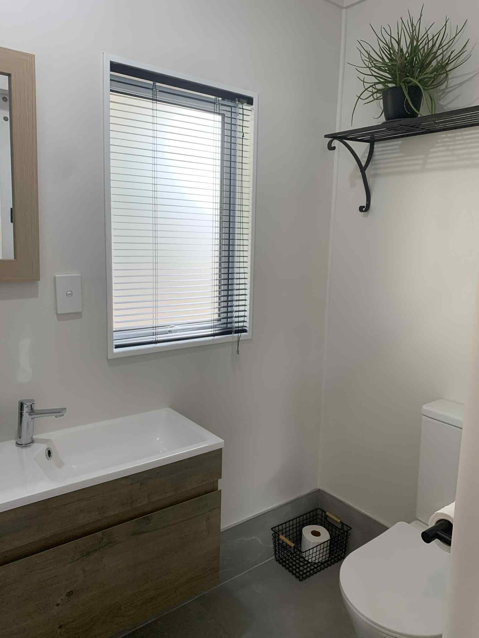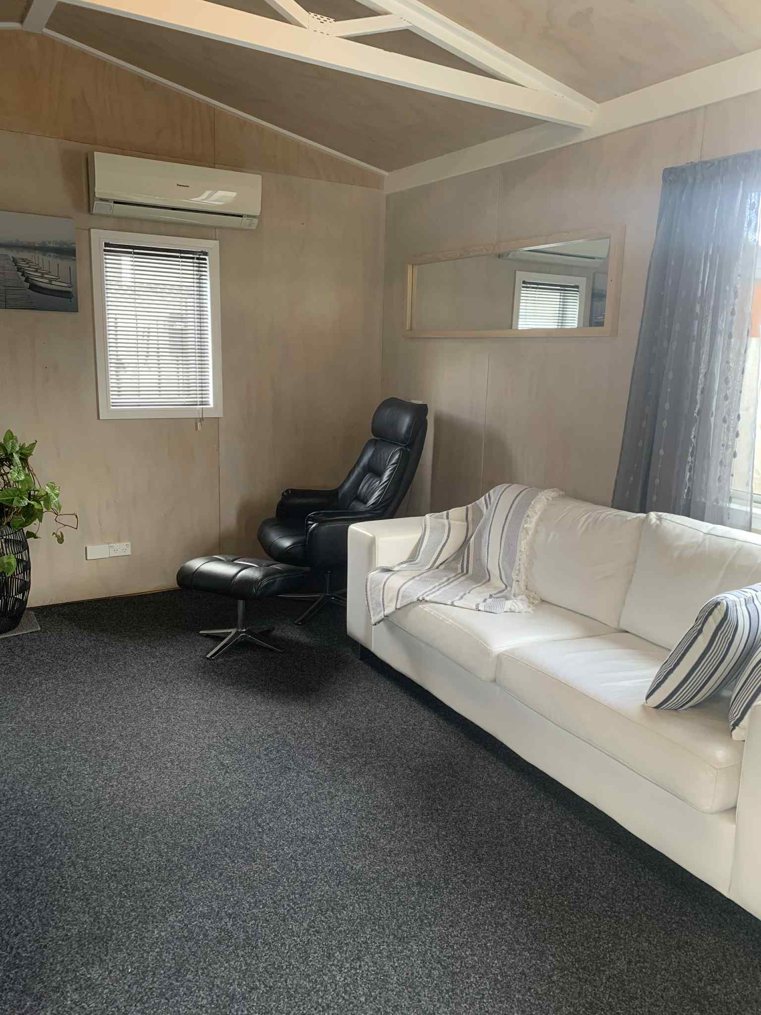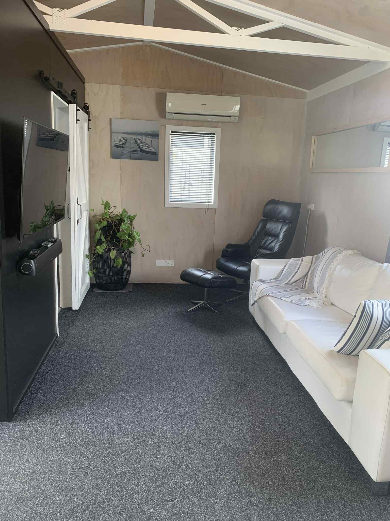 The main cabin is where everyone can come together. It features comfortable seating, a Smart TV, Wi-Fi, a dining table perfect for shared meals or game nights, and a well-equipped kitchen with a bench oven, dishwasher and full-sized fridge. Air conditioning keeps things cosy in winter and cool in summer.