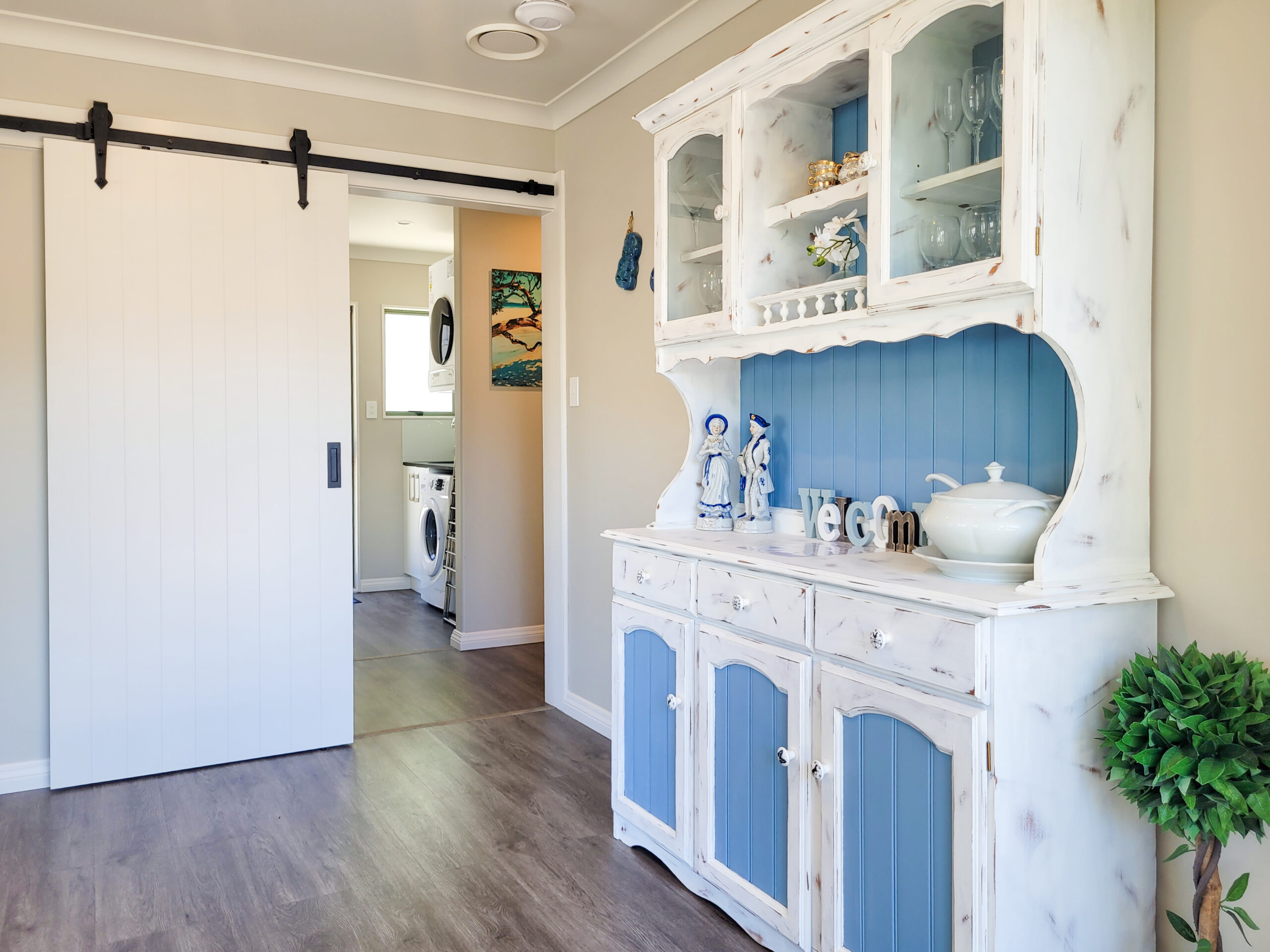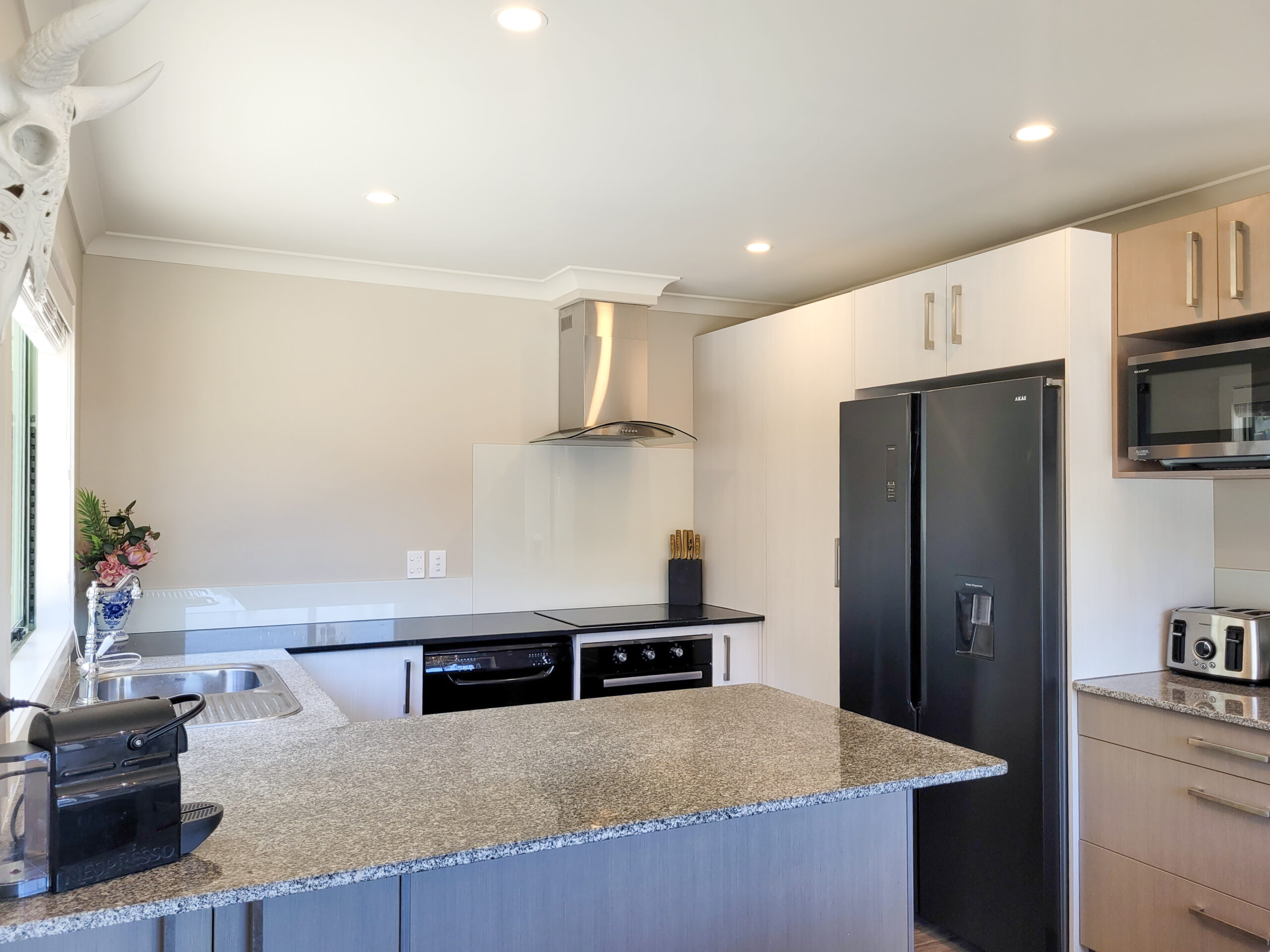 Bright and inviting, the living areas are made for relaxation. The lounge features comfortable seating and a flat-screen TV, while the dining area accommodates up to six guests. The well-equipped kitchen has everything you need for holiday cooking, including a full-size fridge for all your favourite treats. A separate laundry with a washing machine and tumble dryer adds extra convenience.