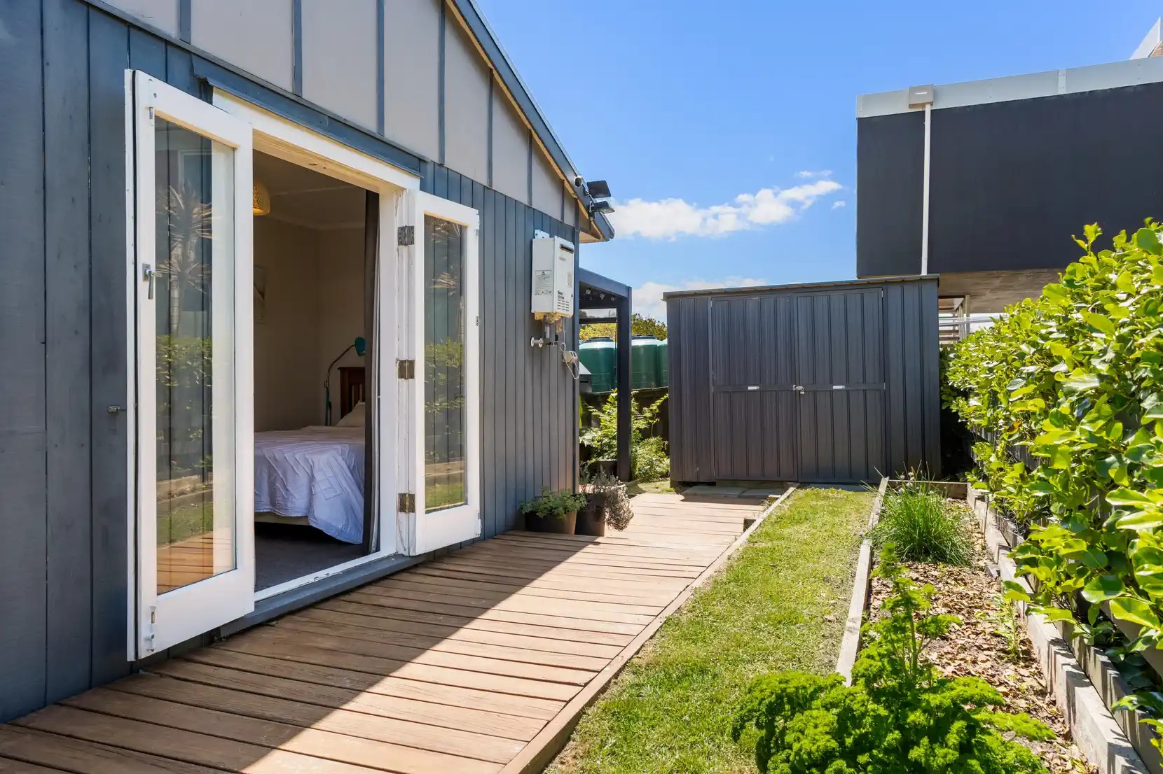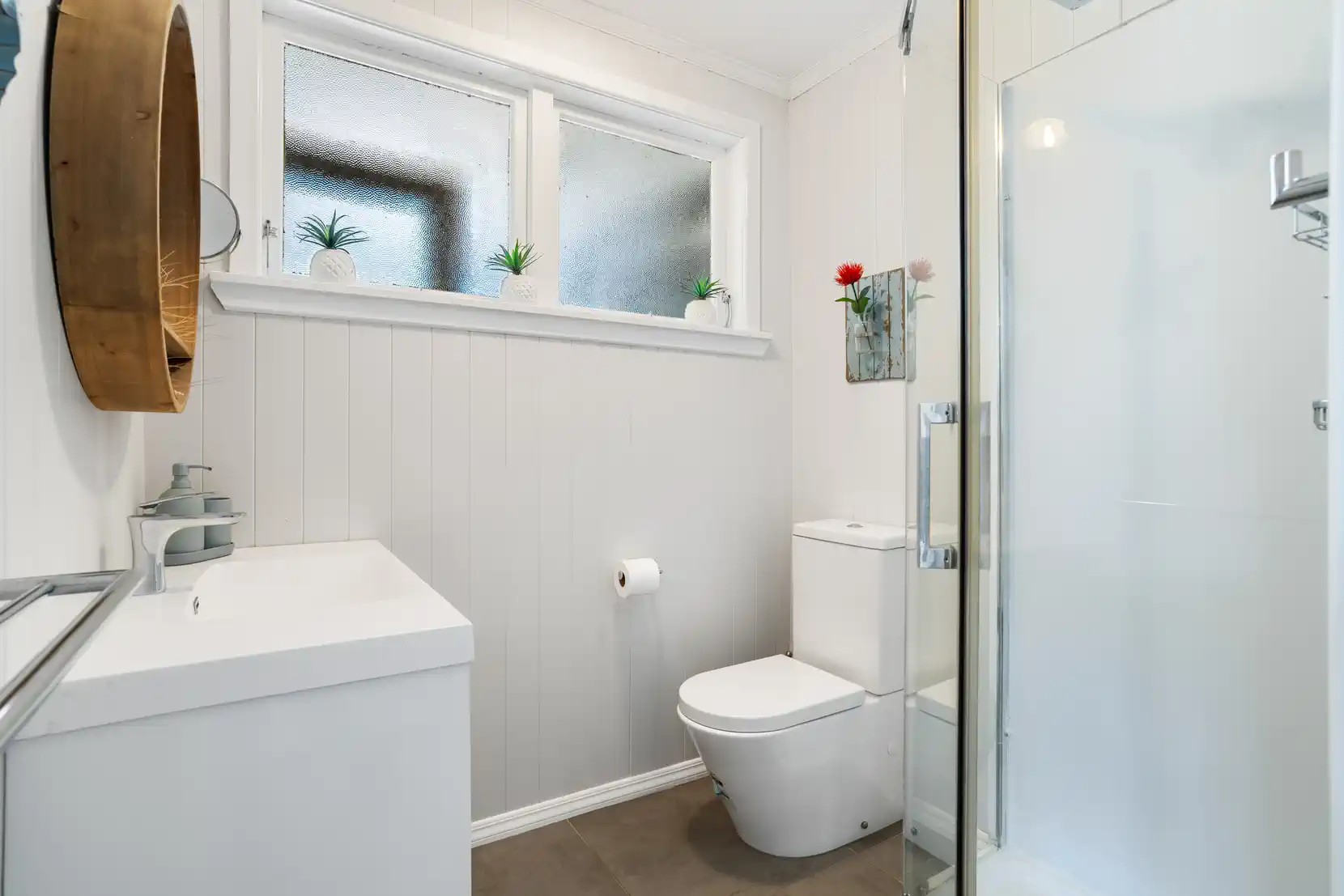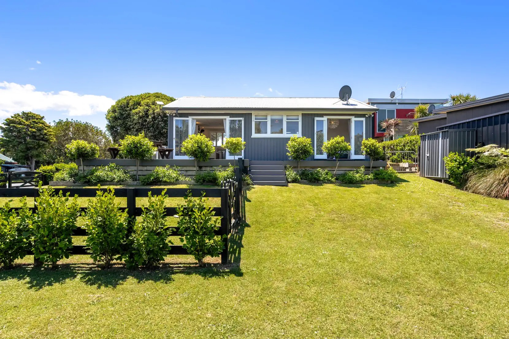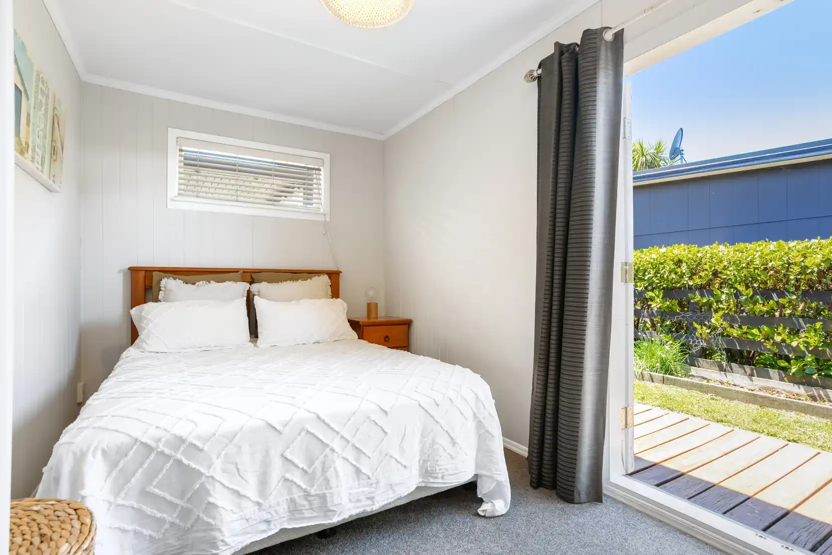 Inside, the bach is light, comfy, and perfect for easy holiday living. There are three inviting bedrooms — two with queen beds, including the main bedroom which opens straight onto the deck, and a third bedroom with a double bed and its own deck access out the front. The main bathroom is fresh and functional with a shower, toilet, and vanity.