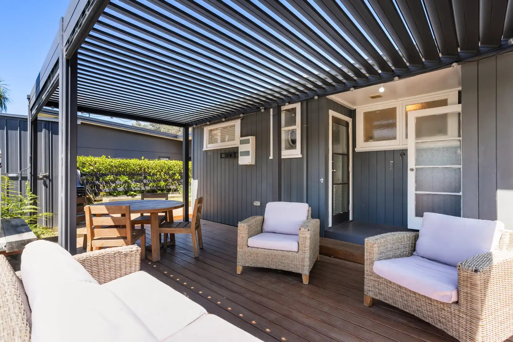 The outdoor living here is a real highlight. The covered deck features a louvred roof you can open up to the sky or close for shade, plus drop-down sides to keep things cosy when needed. Sink into the outdoor couches with a good book, enjoy an afternoon nap, or fire up the outdoor fireplace in the evening, grab a drink, and settle in for long, laughter-filled nights with family and friends.